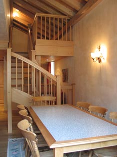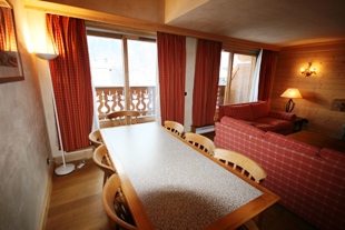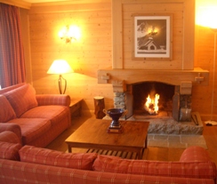 Lounge area – comfortable sofas and chairs, a large open fireplace and Euro satellite TV with a video player. There are large sliding patio-style doors leading to a spacious timber-decked balcony area affording great southerly views of the Mont Blanc Massif.